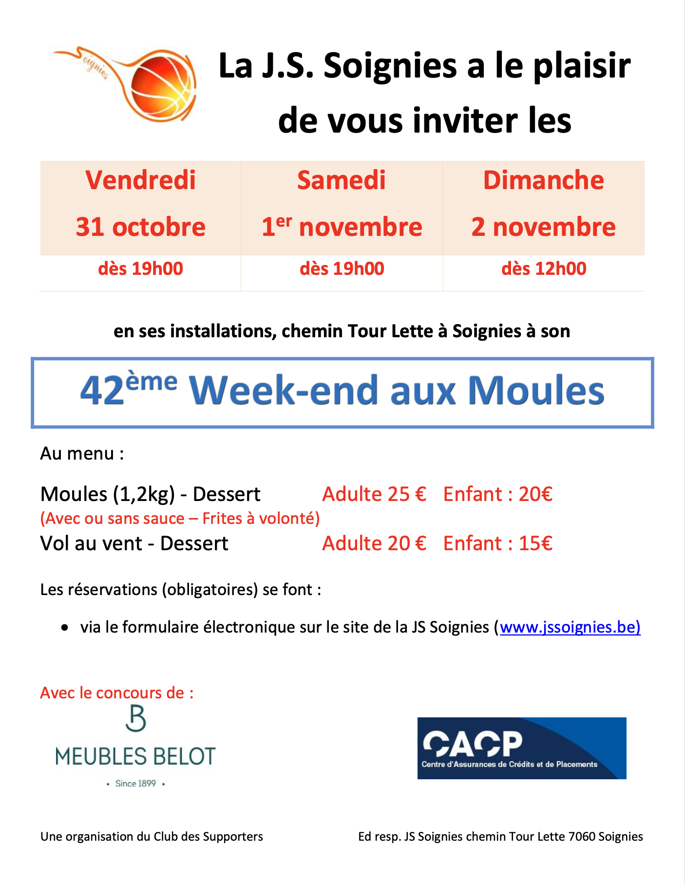 Notre traditionnel Week-end Moules aura lieu les Vendredi 31 octobre, Samedi 1er et dimanche 2 novembre.